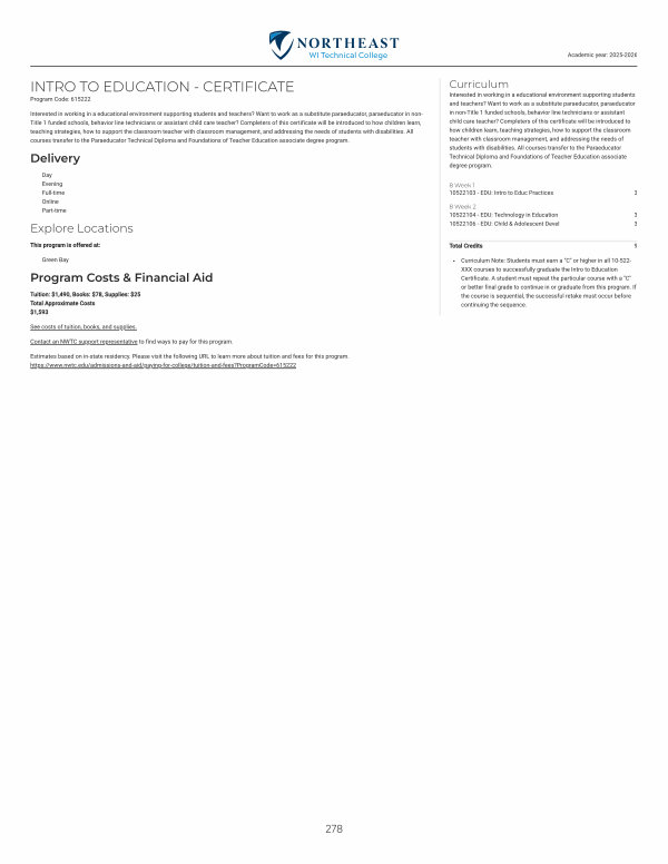 Curriculum Note: Students must earn a " C " or higher in all 10-522- XXX courses to successfully graduate the Intro to Education Certificate. A student must repeat the particular course with a " C " or better final grade to continue in or graduate from this program. If the course is sequential, the successful retake must occur before continuing the sequence.