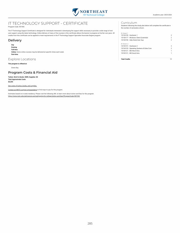 The IT Technology Support Certificate is designed for individuals interested in developing the support skills necessary to provide a wide range of enduser support using the latest technology. Online delivery of many of the courses in this certificate allows the learner to progress at his / her own pace. All credits from this certificate can be applied to meet requirements in the IT Technology Support Specialist Associate Degree program.