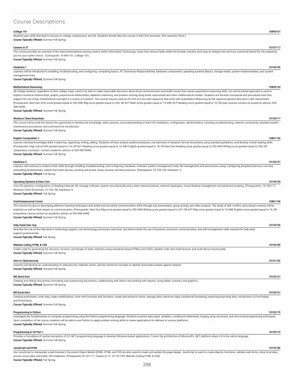 Careers in IT 10107117 This course provides an overview of the interconnectedness among careers within Information Technology. Learn how various fields within the broader industry each play an integral role and how a personal brand fits into preparing you for your career choice.( Corequisite: 10-890-101, College 101) Course Typically Offered: Summer Fall Spring