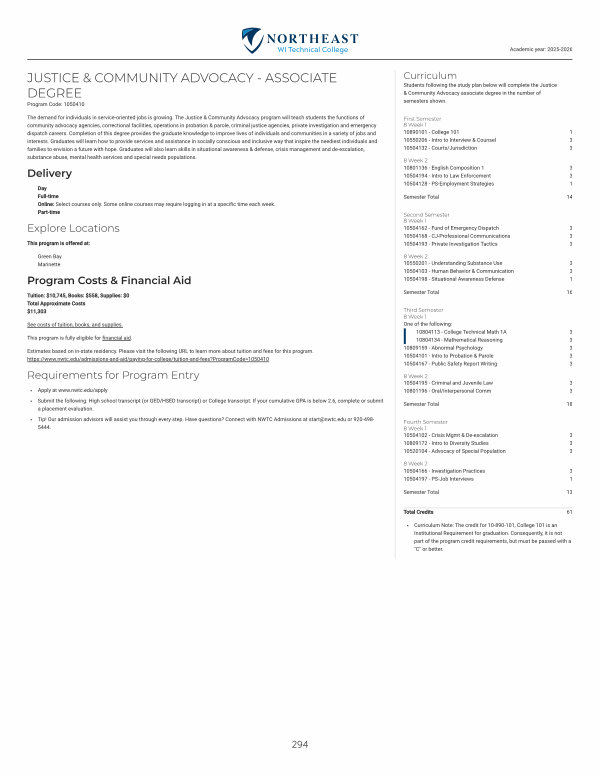 The demand for individuals in service-oriented jobs is growing. The Justice & Community Advocacy program will teach students the functions of community advocacy agencies, correctional facilities, operations in probation & parole, criminal justice agencies, private investigation and emergency dispatch careers. Completion of this degree provides the graduate knowledge to improve lives of individuals and communities in a variety of jobs and interests. Graduates will learn how to provide services and assistance in socially conscious and inclusive way that inspire the neediest individuals and families to envision a future with hope. Graduates will also learn skills in situational awareness & defense, crisis management and de-escalation, substance abuse, mental health services and special needs populations.