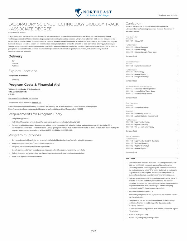 Are you ready for a fast-paced, hands-on career that will maximize your analytical skills and challenge you every day? The Laboratory Science Technology Associate of Applied Sciences Degree program blends key theoretical concepts with practical laboratory skills needed for success in a broad range of science careers, including biological, chemical, and environmental industries as well as academic research laboratories. This program has been designed not only to prepare you for immediate employment, but also to transfer smoothly to local universities, allowing you to start your science education at NWTC and continue toward a bachelor’ s degree and beyond. Courses will focus on experimental design, application of scientific principles in analysis of results, accurate documentation processes, fundamentals of quality measurement, and use of industry-standard instrumentation and protocols.
