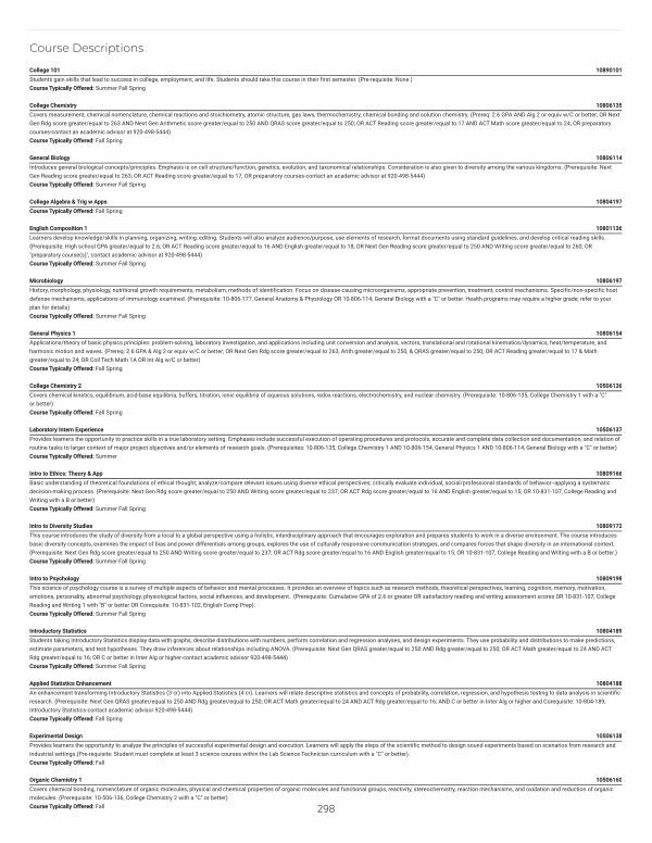 College 101 10890101 Students gain skills that lead to success in college, employment, and life. Students should take this course in their first semester.( Pre-requisite: None.) Course Typically Offered: Summer Fall Spring