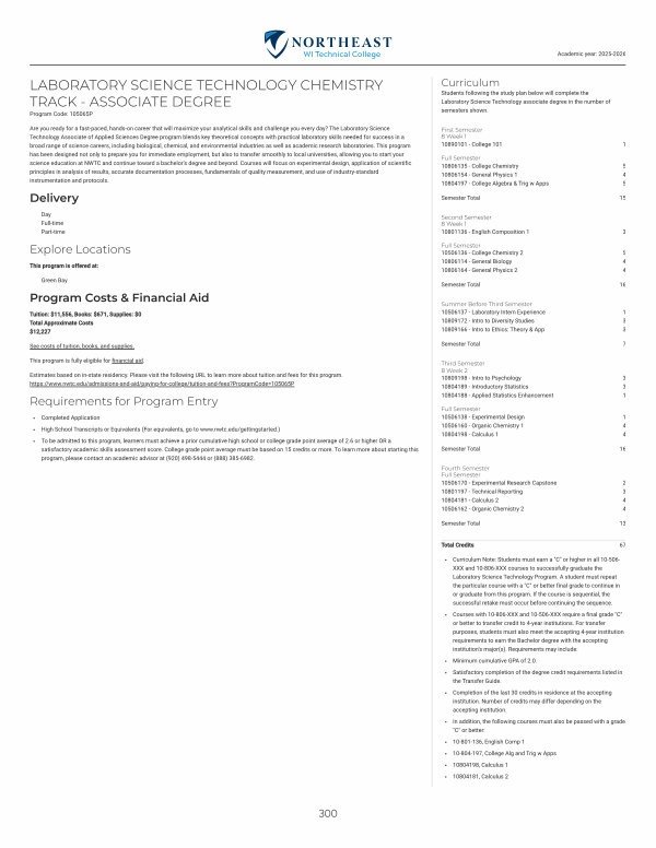 Are you ready for a fast-paced, hands-on career that will maximize your analytical skills and challenge you every day? The Laboratory Science Technology Associate of Applied Sciences Degree program blends key theoretical concepts with practical laboratory skills needed for success in a broad range of science careers, including biological, chemical, and environmental industries as well as academic research laboratories. This program has been designed not only to prepare you for immediate employment, but also to transfer smoothly to local universities, allowing you to start your science education at NWTC and continue toward a bachelor’ s degree and beyond. Courses will focus on experimental design, application of scientific principles in analysis of results, accurate documentation processes, fundamentals of quality measurement, and use of industry-standard instrumentation and protocols.
