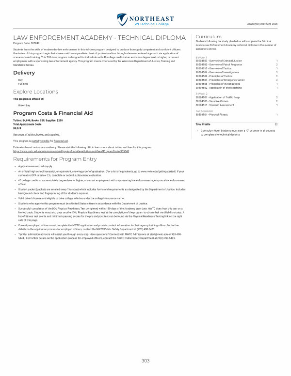 Successful completion of the DOJ Physical Readiness Test completed within 180 days of the Academy start date. NWTC does host this test on a limited basis. Students must also pass another DOJ Physical Readiness test at the completion of the program to obtain their certifiability status. A list of fitness test events and minimum passing scores for the pre and post test can be found via the Physical Readiness Testing link on the right side of this page.