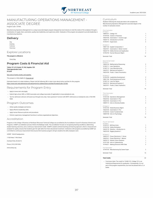Manufacturing Operations Management is a unique associate degree program designed by local industry to meet the needs of the workplace through a combination of supply chain, automation, quality, lean leadership, and supervisory skills. Graduates of this program are prepared to provide leadership in manufacturing industries.