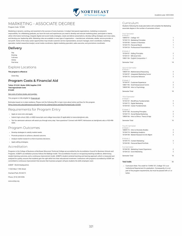 Programs in the College of Business at Northeast Wisconsin Technical College are accredited by the Accreditation Council for Business Schools and Programs. ACBSP ' s accreditation process follows the Baldrige model. The accreditation focuses on recognizing teaching excellence, determining student learning outcomes, and a continuous improvement model. ACBSP’ s student-centered teaching and learning approach, which is measured and analyzed for quality, ensures that students gain the right skills from their educational investment. Institutions with programs accredited by ACBSP are committed to continuous improvement that ensures their business program will give students the skills employers want.