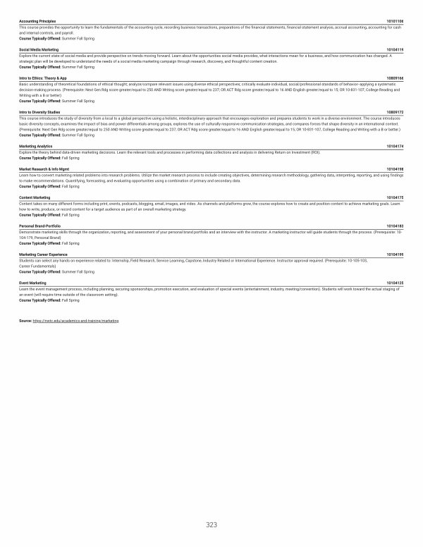Personal Brand-Portfolio 10104183 Demonstrate marketing skills through the organization, reporting, and assessment of your personal brand portfolio and an interview with the instructor. A marketing instructor will guide students through the process.( Prerequisite: 10- 104-179, Personal Brand) Course Typically Offered: Fall Spring