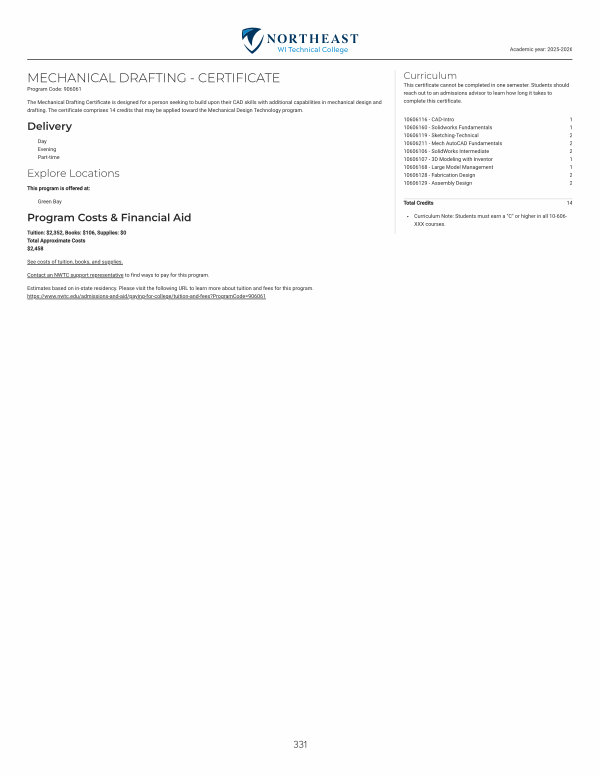 The Mechanical Drafting Certificate is designed for a person seeking to build upon their CAD skills with additional capabilities in mechanical design and drafting. The certificate comprises 14 credits that may be applied toward the Mechanical Design Technology program.