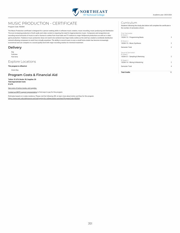 The Music Production certificate is designed for a person seeking skills in software music creation, music recording, music producing and distribution. The ever-increasing production of both audio and video content is requiring the need for legal production music. Composers and songwriters are recording record amounts of music to sell or license to outlets from local radio and TV stations to major Hollywood productions as well as in video game production. Freelance music production does not need to be centered near large media outlets as the web has created a worldwide distribution network allowing composers to work from virtually anywhere. The ability to record music in even a small home studio has become increasingly economical and can compete on a sound quality level with major recording studios for minimal investment.