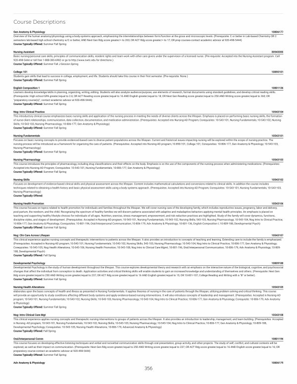 Nsg: Clin Care Across Lifespan 10543107 This clinical experience applies nursing concepts and therapeutic interventions to patients across the lifespan. It also provides an introduction to concepts of teaching and learning. Extending care to include the family is emphasized.( Prerequisites: Accepted in Nursing-AD program; 10-543-101, Nursing Fundamentals; 10-543-102, Nursing Skills; 543-103, Nursing Pharmacology; 10-543-104, Nsg Intro to Clinical Practice; 10-806-177, Gen Anatomy & Physiology; Corequisites: 10-543-105, Nsg Health Alterations; 10-543-106, Nursing Health Promotion; 10-543-108, Nsg Intro to Clinical Care Mgmt; 10-801-196, Oral / Interpersonal Communication; 10-806-179, Adv Anatomy & Physiology; 10-809- 188, Developmental Psych) Course Typically Offered: Fall Spring