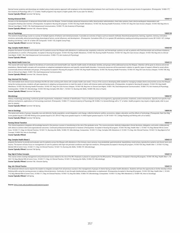 Nursing Clinical Transition 10543116 This clinical experience integrates all knowledge learned in the previous courses in transitioning to the role of the graduate nurse. The course promotes relatively independent clinical decisions, delegation, and works collaboratively with others to achieve client and organizational outcomes. Continued professional development is fostered.( Prerequisites: Accepted in Nursing-AD program; 10-543-109, Nsg: Health Alter 1; 10-543-110, Nsg; Mental Hlth & Comm Conc; 10-543-111, Nsg: Int Clinical Practice; 10-543-112, Nursing Adv Skills; 10-806-197, Microbiology; Corequisites: 10-543-113, Nsg: Complex Hlth Alterations 2; 10-543-115, Nsg: Adv Clinical Practice; 10-543-114, Nsg Mgmt & Prof Concept; 10-809-196, Intro to Sociology) Course Typically Offered: