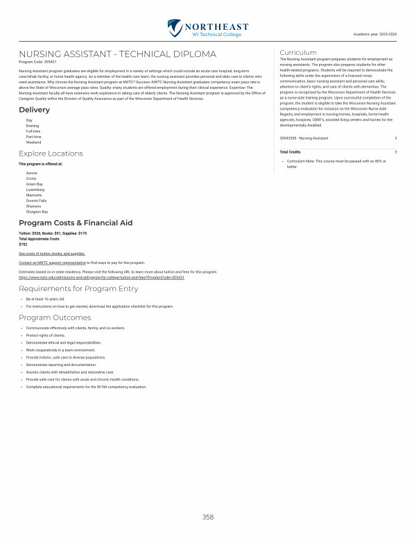 Nursing Assistant program graduates are eligible for employment in a variety of settings which could include an acute care hospital, long-term care / rehab facility, or home health agency. As a member of the health care team, the nursing assistant provides personal and daily care to clients who need assistance. Why choose the Nursing Assistant program at NWTC? Success--NWTC Nursing Assistant graduates competency exam pass rate is above the State of Wisconsin average pass rates. Quality--many students are offered employment during their clinical experience. Expertise--The Nursing Assistant faculty all have extensive work experience in taking care of elderly clients. The Nursing Assistant program is approved by the Office of Caregiver Quality within the Division of Quality Assurance as part of the Wisconsin Department of Health Services.