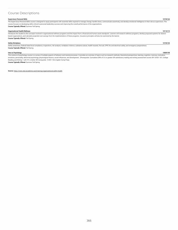 Safety-Workplace 10196136 Safety awareness, federal / state / local compliance, inspections, risk analysis, workplace violence, substance abuse, health hazards, first aid, CPR, fire and electrical safety, and emergency preparedness. Course Typically Offered: Fall Spring