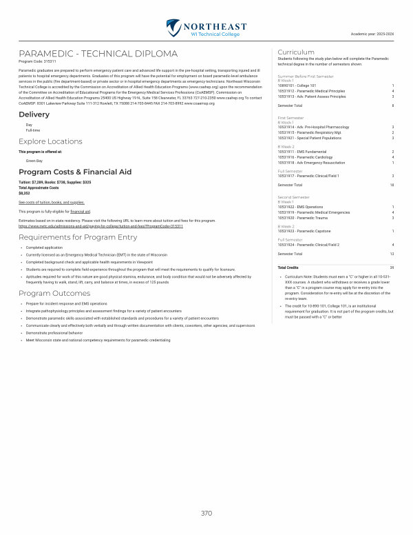 Paramedic graduates are prepared to perform emergency patient care and advanced life support in the pre-hospital setting, transporting injured and ill patients to hospital emergency departments. Graduates of this program will have the potential for employment on board paramedic-level ambulance services in the public( fire department-based) or private sector or in hospital emergency departments as emergency technicians. Northeast Wisconsin Technical College is accredited by the Commission on Accreditation of Allied Health Education Programs( www. caahep. org) upon the recommendation of the Committee on Accreditation of Educational Programs for the Emergency Medical Services Professions( CoAEMSP). Commission on Accreditation of Allied Health Education Programs 25400 US Highway 19 N., Suite 158 Clearwater, FL 33763 727-210-2350 www. caahep. org To contact CoAEMSP: 8301 Lakeview Parkway Suite 111-312 Rowlett, TX 75088 214-703-8445 FAX 214-703-8992 www. coaemsp. org