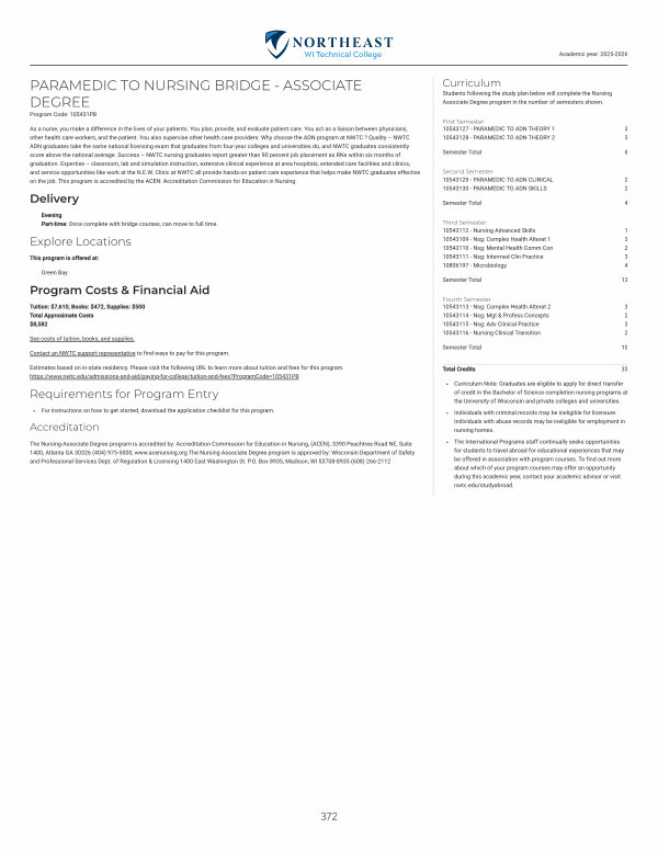 Curriculum Note: Graduates are eligible to apply for direct transfer of credit in the Bachelor of Science completion nursing programs at the University of Wisconsin and private colleges and universities.