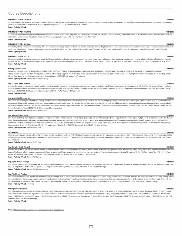 PARAMEDIC TO ADN THEORY 1 10543127 nursing process implemented to relate care of patients throughout the lifespan with alterations in cognition, elimination, comfort, grief / loss, mobility, skin integrity, and fluid / electrolyte balance and related principles of pharmacology.( Prerequisite: Accepted in Paramedic-RN Bridge program; Corequisite: 10-543-128, Paramedic to ADN Theory 2) Course Typically Offered: