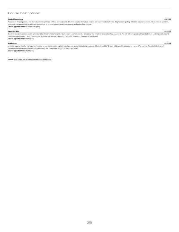 Phlebotomy 10513111 provides opportunities for you to perform routine venipuncture, routine capillary puncture and special collection procedures.( Student must be 18 years old to enroll in phlebotomy course.( Prerequisite: Accepted into Medical Laboratory Technician program or Phlebotomy certificate; Corequisite: 10-513-110, Basic Lab Skills.) Course Typically Offered: Fall Spring