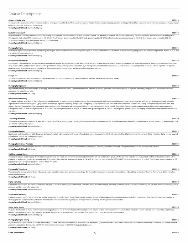 Photography-Lightroom 10203180 organize and manage a library of images by applying metadata and backup solutions. Course content covers functions of Adobe Lightroom. Creatively edit photos using basic retouching, image detailing and color correction in preparation for publishing or print. Course Typically Offered: Fall Spring