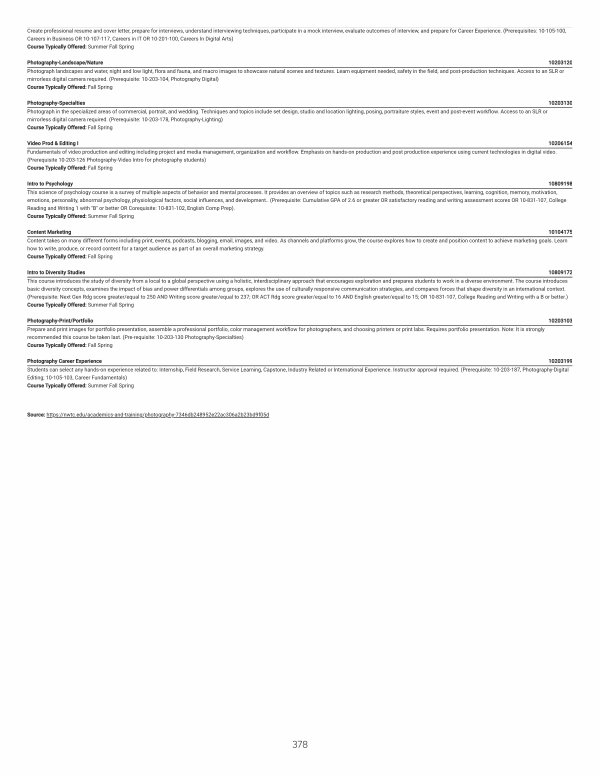 Photography-Print / Portfolio 10203103 Prepare and print images for portfolio presentation, assemble a professional portfolio, color management workflow for photographers, and choosing printers or print labs. Requires portfolio presentation. Note: It is strongly recommended this course be taken last.( Pre-requisite: 10-203-130 Photography-Specialties) Course Typically Offered: Fall Spring
