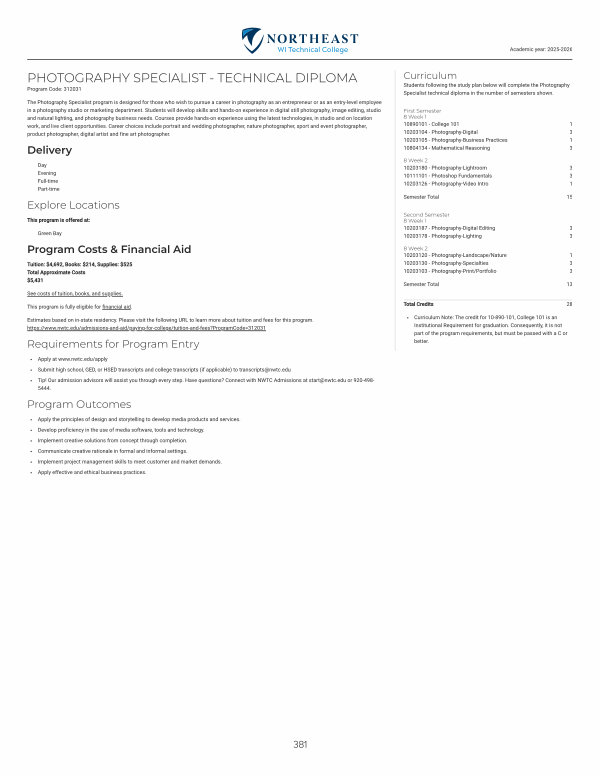 The Photography Specialist program is designed for those who wish to pursue a career in photography as an entrepreneur or as an entry-level employee in a photography studio or marketing department. Students will develop skills and hands-on experience in digital still photography, image editing, studio and natural lighting, and photography business needs. Courses provide hands-on experience using the latest technologies, in studio and on location work, and live client opportunities. Career choices include portrait and wedding photographer, nature photographer, sport and event photographer, product photographer, digital artist and fine art photographer.
