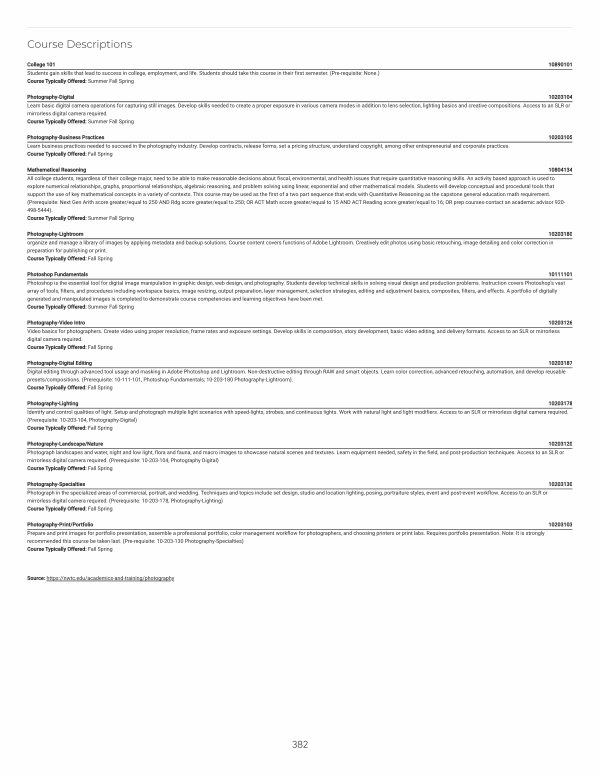 Photography-Print / Portfolio 10203103 Prepare and print images for portfolio presentation, assemble a professional portfolio, color management workflow for photographers, and choosing printers or print labs. Requires portfolio presentation. Note: It is strongly recommended this course be taken last.( Pre-requisite: 10-203-130 Photography-Specialties) Course Typically Offered: Fall Spring