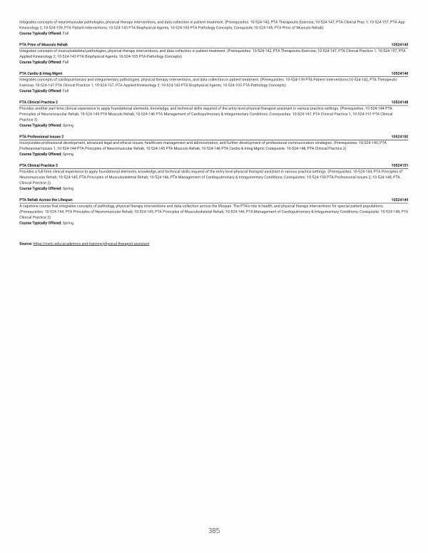 PTA Professional Issues 2 10524150 Incorporates professional development, advanced legal and ethical issues, healthcare management and administration, and further development of professional communication strategies.( Prerequisites: 10-524-140, PTA Professional Issues 1, 10-524-144 PTA Principles of Neuromuscular Rehab, 10-524-145 PTA Musculo Rehab, 10-524-146 PTA Cardio & Integ Mgmt; Corequisite: 10-524-148, PTA Clinical Practice 2) Course Typically Offered: Spring