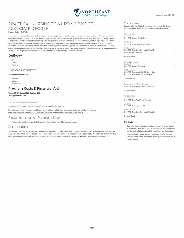 Curriculum Note: Graduates are eligible to apply for direct transfer of credit in the Bachelor of Science completion nursing programs at the University of Wisconsin and private colleges and universities.