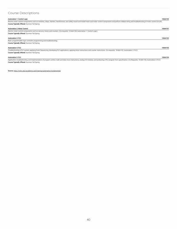 Automation 5: PLC 10664104 Application, troubleshooting, and implementation of program control, math and data move instructions, analog I / O modules, and producing a PLC program from specification.( Co-Requisite: 10-664-103, Automation 4: PLC) Course Typically Offered: Summer Fall Spring