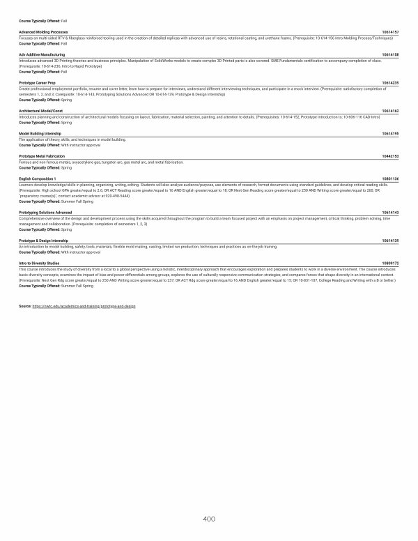 Prototype Career Prep 10614239 Create professional employment portfolio, resume and cover letter, learn how to prepare for interviews, understand different interviewing techniques, and participate in a mock interview.( Prerequisite: satisfactory completion of semesters 1, 2, and 3; Corequisite: 10-614-143, Prototyping Solutions Advanced OR 10-614-139, Prototype & Design Internship) Course Typically Offered: Spring