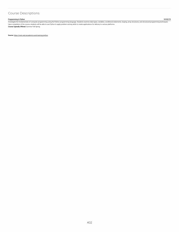 Programming in Python 10152170 Investigate the fundamentals of computer programming using the Python programming language. Students examine data types, variables, conditional statements, looping, array structures, and structured programming techniques. Upon completion of the course, students will be able to use Python to apply problem solving skills to create applications for delivery to various platforms. Course Typically Offered: Summer Fall Spring