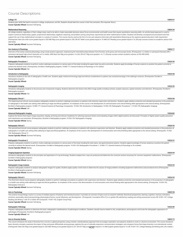 Radiographic Pathology 10526189 Prepares radiography students to determine the basic radiographic manifestations of pathological conditions. Students classify trauma related to site, complications, and prognosis and locate the radiographic appearance of pathologies( Prerequisite: Enrolled in Radiography program) Course Typically Offered: Fall