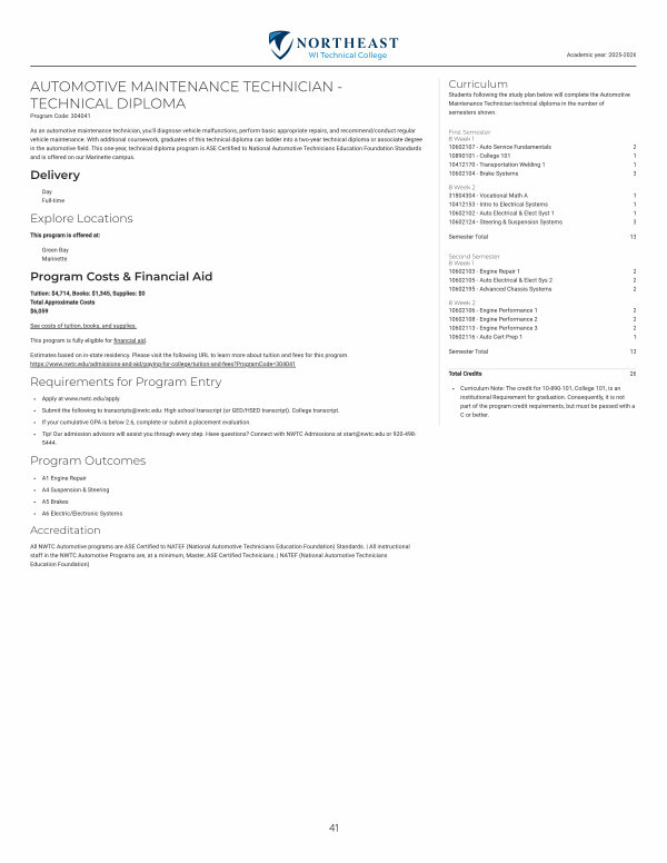 As an automotive maintenance technician, you ' ll diagnose vehicle malfunctions, perform basic appropriate repairs, and recommend / conduct regular vehicle maintenance. With additional coursework, graduates of this technical diploma can ladder into a two-year technical diploma or associate degree in the automotive field. This one-year, technical diploma program is ASE Certified to National Automotive Technicians Education Foundation Standards and is offered on our Marinette campus.
