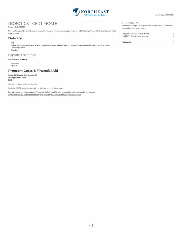 This certificate provides a hands-on experience with the application, operation, programming and troubleshooting of industrial robots and use of robotic vision systems.