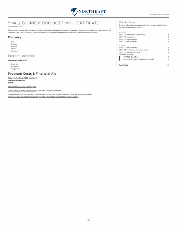 This certificate is designed for the person seeking new or additional training in the area of managing the accounting records for a small business. All credits from this certificate may be applied toward the Accounting associate degree or the Accounting Assistant technical diploma.