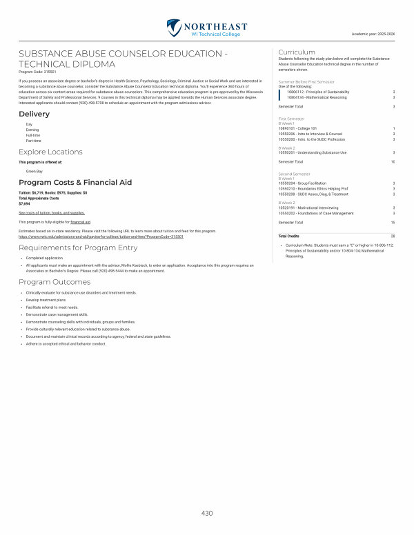If you possess an associate degree or bachelor’ s degree in Health Science, Psychology, Sociology, Criminal Justice or Social Work and are interested in becoming a substance abuse counselor, consider the Substance Abuse Counselor Education technical diploma. You ' ll experience 360 hours of education across six content areas required for substance abuse counselors. This comprehensive education program is pre-approved by the Wisconsin Department of Safety and Professional Services. 9 courses in this technical diploma may be applied towards the Human Services associate degree. Interested applicants should contact( 920) 498-5708 to schedule an appointment with the program admissions advisor.