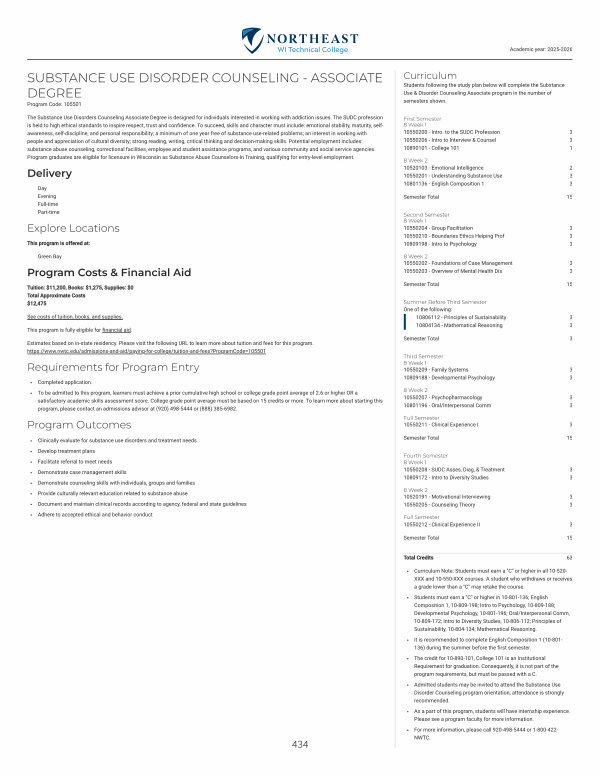 The Substance Use Disorders Counseling Associate Degree is designed for individuals interested in working with addiction issues. The SUDC profession is held to high ethical standards to inspire respect, trust and confidence. To succeed, skills and character must include: emotional stability, maturity, selfawareness, self-discipline, and personal responsibility; a minimum of one year free of substance use-related problems; an interest in working with people and appreciation of cultural diversity; strong reading, writing, critical thinking and decision-making skills. Potential employment includes: substance abuse counseling, correctional facilities, employee and student assistance programs, and various community and social service agencies. Program graduates are eligible for licensure in Wisconsin as Substance Abuse Counselors-In Training, qualifying for entry-level employment.