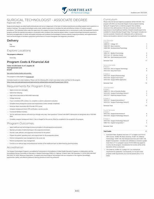 Please note, the last tech diploma acceptance will be Fall 2023. The program will shift to an Associate Degree( 2-year program) starting Spring 24. Surgical Tech is a full-time program that combines classroom time, skills practice in the lab, and hands on clinical experiences in local healthcare facilities. Students should expect to be available for classes Monday through Friday. The program includes one Summer semester. Students will collaborate with an Admissions Advisor and Academic Advisor to move from application to enrollment.