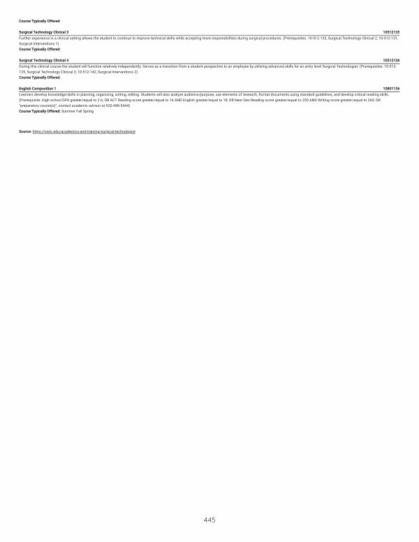 Surgical Technology Clinical 4 10512136 During this clinical course the student will function relatively independently. Serves as a transition from a student perspective to an employee by utilizing advanced skills for an entry level Surgical Technologist.( Prerequisites: 10-512- 135, Surgical Technology Clinical 3; 10-512-142, Surgical Interventions 2) Course Typically Offered: