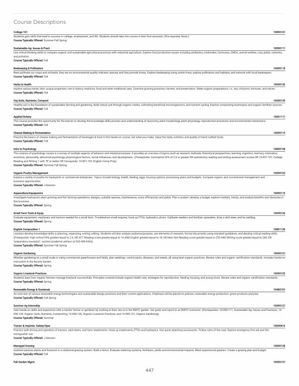 Summer Ag Internship 10090127 Gain hands-on skills and experience with a mentor farmer or gardener by working at their site or in the NWTC garden. Set goals and report to an NWTC instructor.( Prerequisites: 10-090-111, Sustainable Ag: Issues and Practices; 10- 090-139, Organic Soils, Nutrients, Composting; 10-090-120, Organic Livestock Practices; and 10-090-131, Organic Gardening) Course Typically Offered: Summer