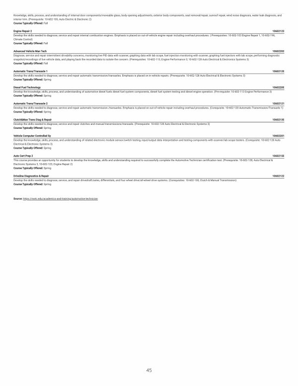 Automatic Trans / Transaxle 1 10602120 Develop the skills needed to diagnose, service and repair automatic transmission / transaxles. Emphasis is placed on in-vehicle repairs.( Prerequisite: 10-602-128 Auto Electrical & Electronic Systems 3) Course Typically Offered: Spring