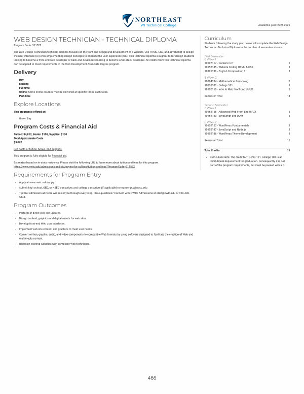 The Web Design Technician technical diploma focuses on the front-end design and development of a website. Use HTML, CSS, and JavaScript to design the user interface( UI) while implementing design concepts to enhance the user experience( UX). This technical diploma is a great fit for design students looking to become a front-end web developer or back-end developers looking to become a full-stack developer. All credits from this technical diploma can be applied to meet requirements in the Web Development Associate Degree program.