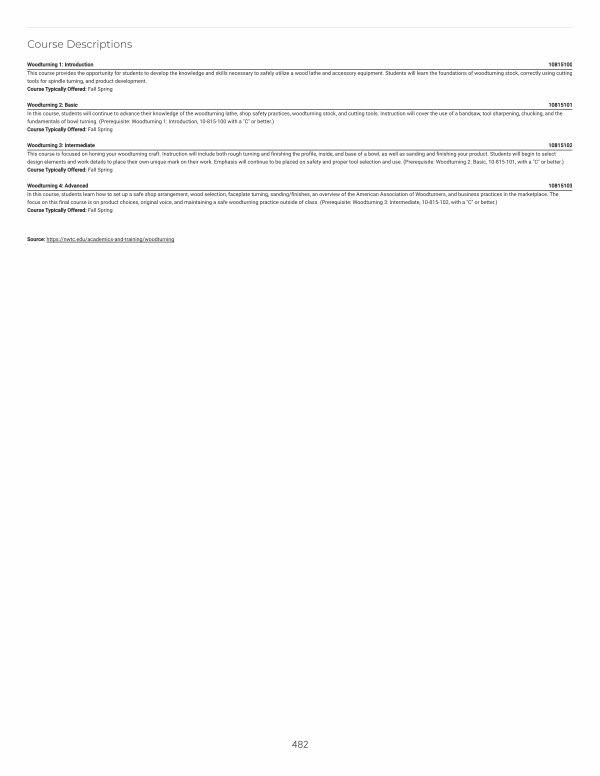 Woodturning 4: Advanced 10815103 In this course, students learn how to set up a safe shop arrangement, wood selection, faceplate turning, sanding / finishes, an overview of the American Association of Woodturners, and business practices in the marketplace. The focus on this final course is on product choices, original voice, and maintaining a safe woodturning practice outside of class.( Prerequisite: Woodturning 3: Intermediate, 10-815-102, with a " C " or better.) Course Typically Offered: Fall Spring