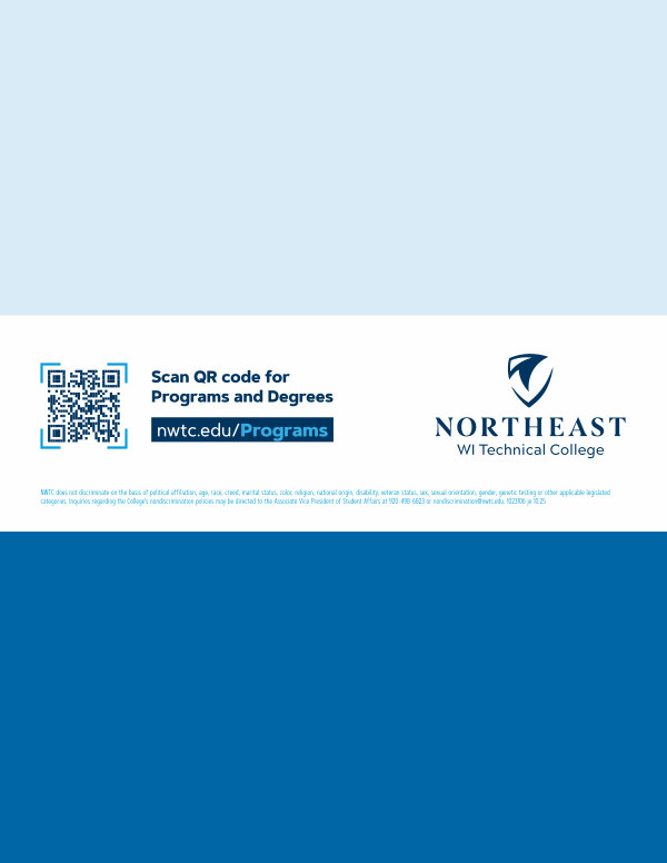 NWTC does not discriminate on the basis of political affiliation, age, race, creed, marital status, color, religion, national origin, disability, veteran status, sex, sexual orientation, gender, genetic testing or other applicable legislated categories. Inquiries regarding the College’ s nondiscrimination policies may be directed to the Associate Vice President of Student Affairs at 920-498-6823 or nondiscrimination @ nwtc. edu. 1023106 je 10.25