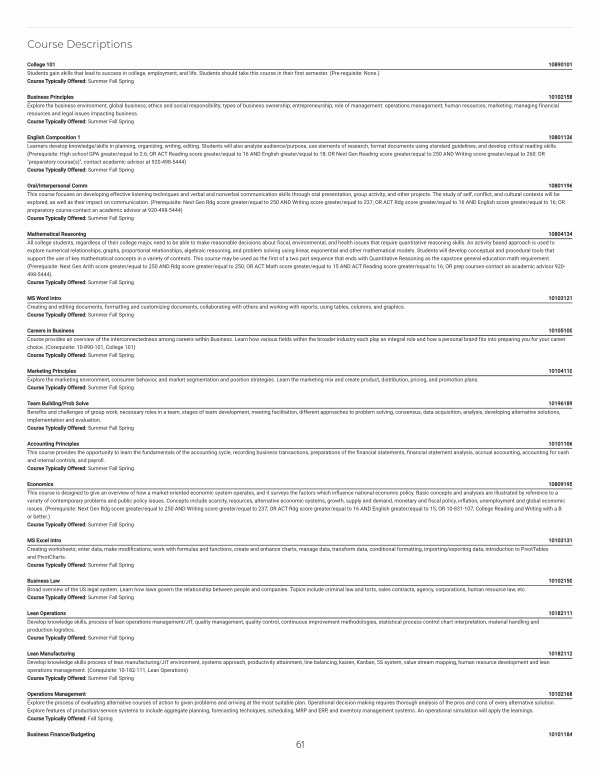 College 101 10890101 Students gain skills that lead to success in college, employment, and life. Students should take this course in their first semester.( Pre-requisite: None.) Course Typically Offered: Summer Fall Spring