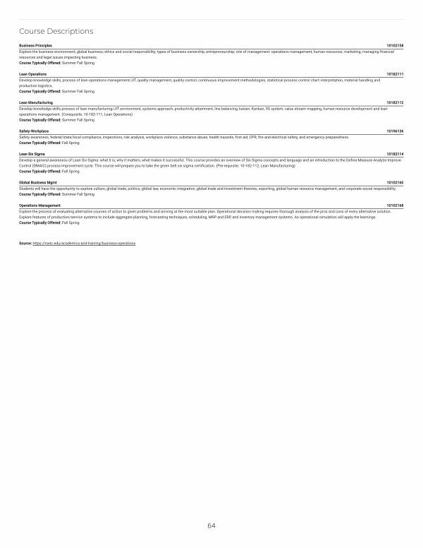 Lean Operations 10182111 Develop knowledge skills, process of lean operations management / JIT, quality management, quality control, continuous improvement methodologies, statistical process control chart interpretation, material handling and production logistics. Course Typically Offered: Summer Fall Spring
