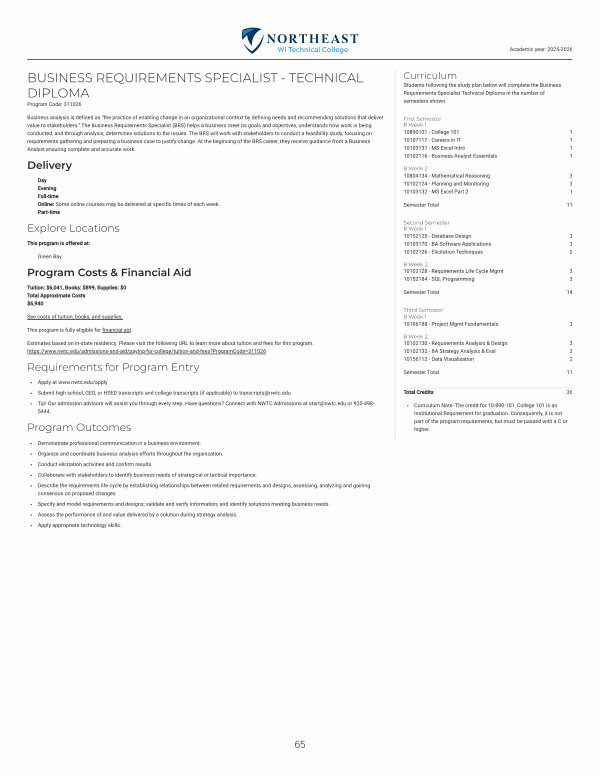 Students following the study plan below will complete the Business Requirements Specialist Technical Diploma in the number of semesters shown.