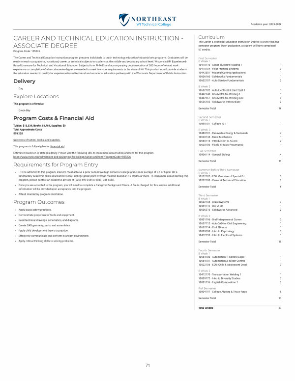 The Career & Technical Education Instruction Degree is a two-year, fivesemester program. Upon graduation, a student will have completed 67 credits.