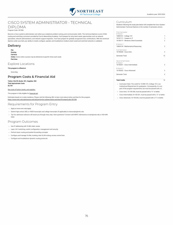 Become a Cisco systems administrator and utilize your analytical, problem-solving, and communication skills. This technical diploma covers CCNA routing and switching curriculum provided by Cisco ' s Networking Academy. You ' ll prepare for entry-level career opportunities such as network specialists, network administrators, and network support engineers. You ' ll also prepare for globally recognized Cisco certifications. With this technical diploma under your belt, your ability to install, configure, operate, and troubleshoot medium-sized routed and switched networks is validated.