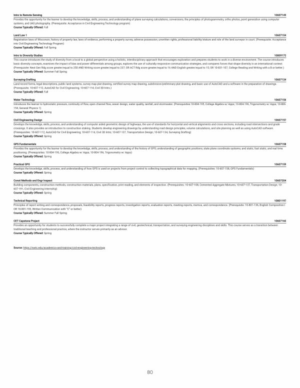 Surveying-Drafting 10607134 Land record forms, legal descriptions, public land systems, survey map plat drawing, certified survey map drawing, subdivision / preliminary plat drawing, and basic use of AutoCAD and a software in the preparation of drawings.( Prerequisite: 10-607-112, AutoCAD for Civil Engineering; 10-607-114, Civil 3D-Intro.) Course Typically Offered: Fall