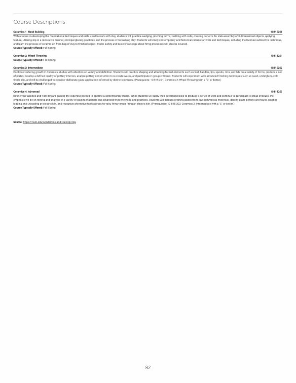 Ceramics 3: Intermediate 10815202 Continue fostering growth in Ceramics studies with attention on variety and definition. Students will practice shaping and attaching formal elements such as feet, handles, lips, spouts, rims, and lids on a variety of forms, produce a set of plates, develop a defined quality of pottery interiors, analyze pottery construction to re-create wares, and participate in group critiques. Students will experiment with advanced finishing techniques such as wash, underglaze, cold finish, slip, and will be challenged to consider deliberate glaze application informed by distinct elements.( Prerequisite: 10-815-201, Ceramics 2: Wheel Throwing with a " C " or better.) Course Typically Offered: Fall Spring